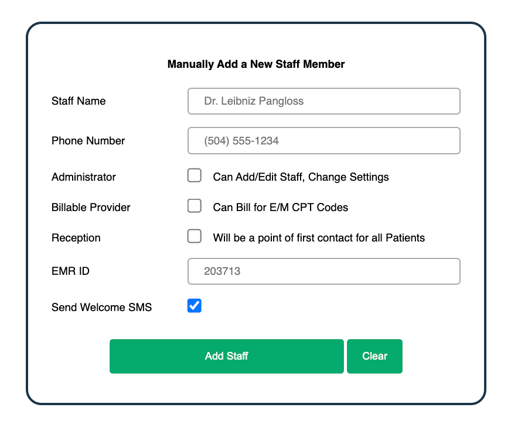 Enter the provider or staff member’s name, phone number, EMR ID if applicable.